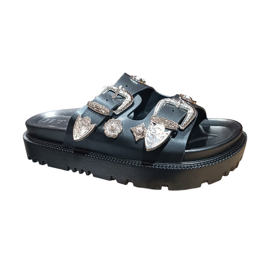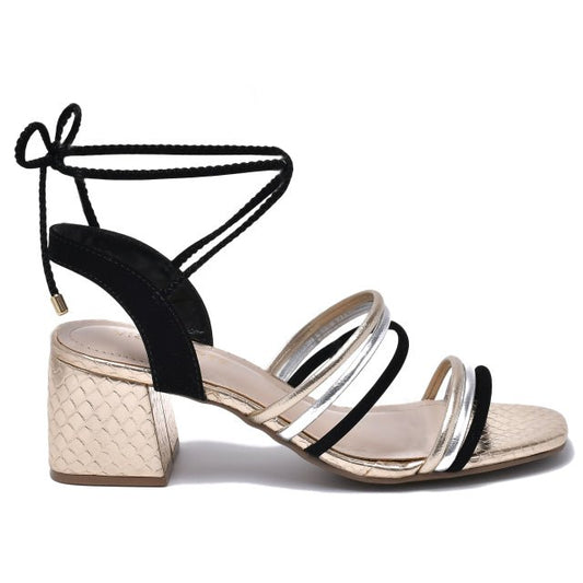 SANDALIA TACO BAJO LIVE NEGRO PLATA ORO.