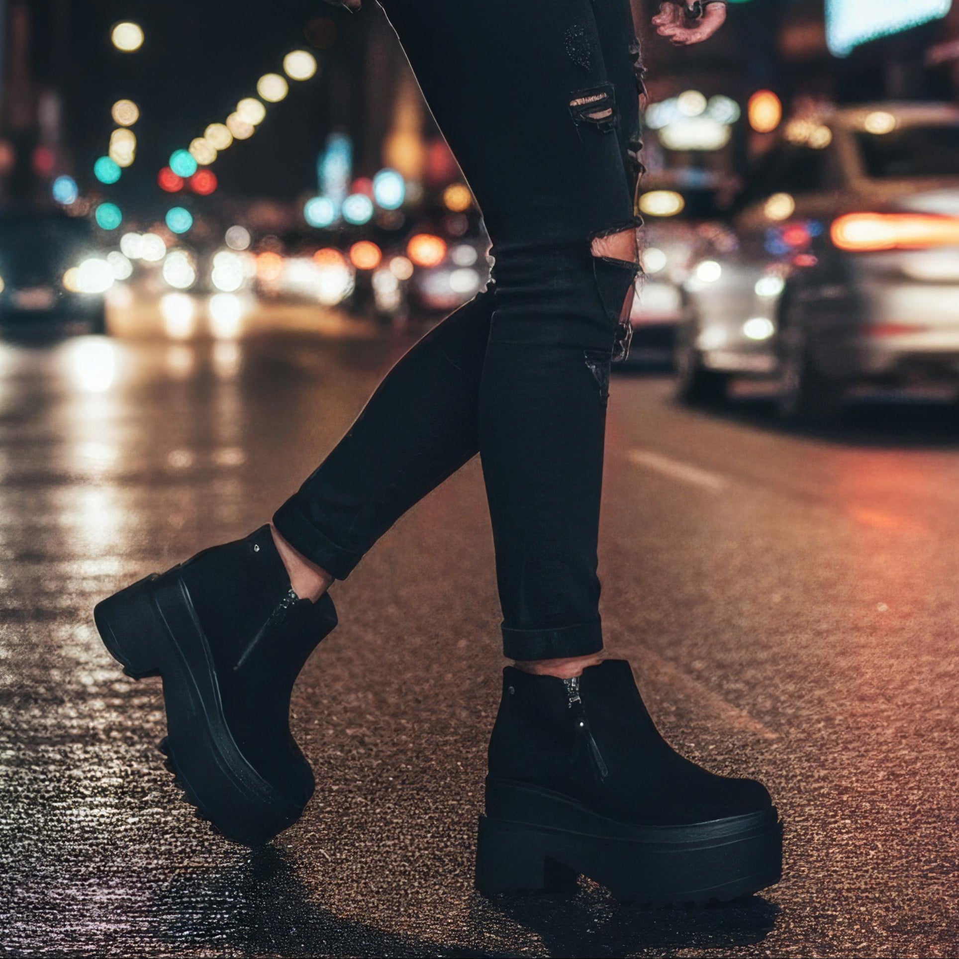 ¡Aumenta tu estilo y altura con nuestro elegante botín de gamuza con plataforma y cierres en color negro! El diseño moderno y cómodo te mantendrá a la moda, mientras que los cierres te brindan un ajuste perfecto. ¡Haz una declaración de moda con este increíble botín!